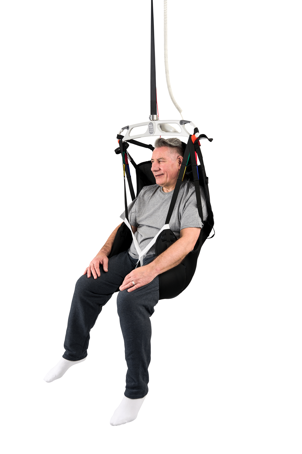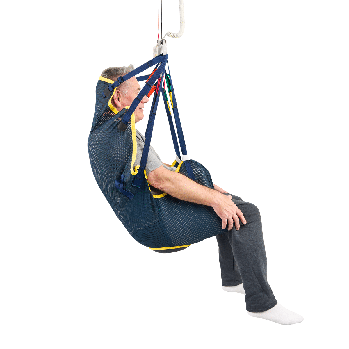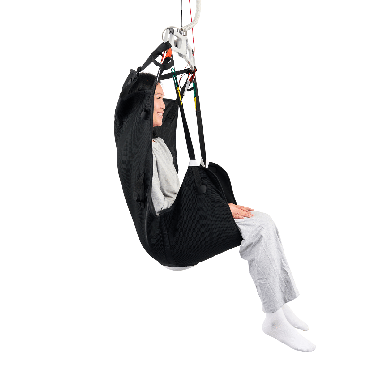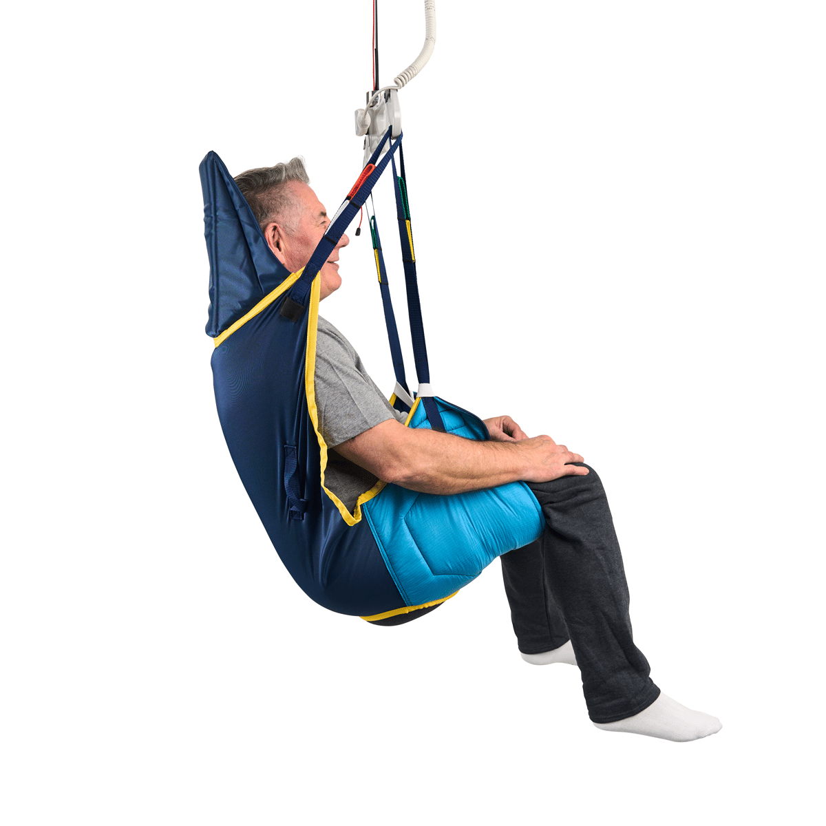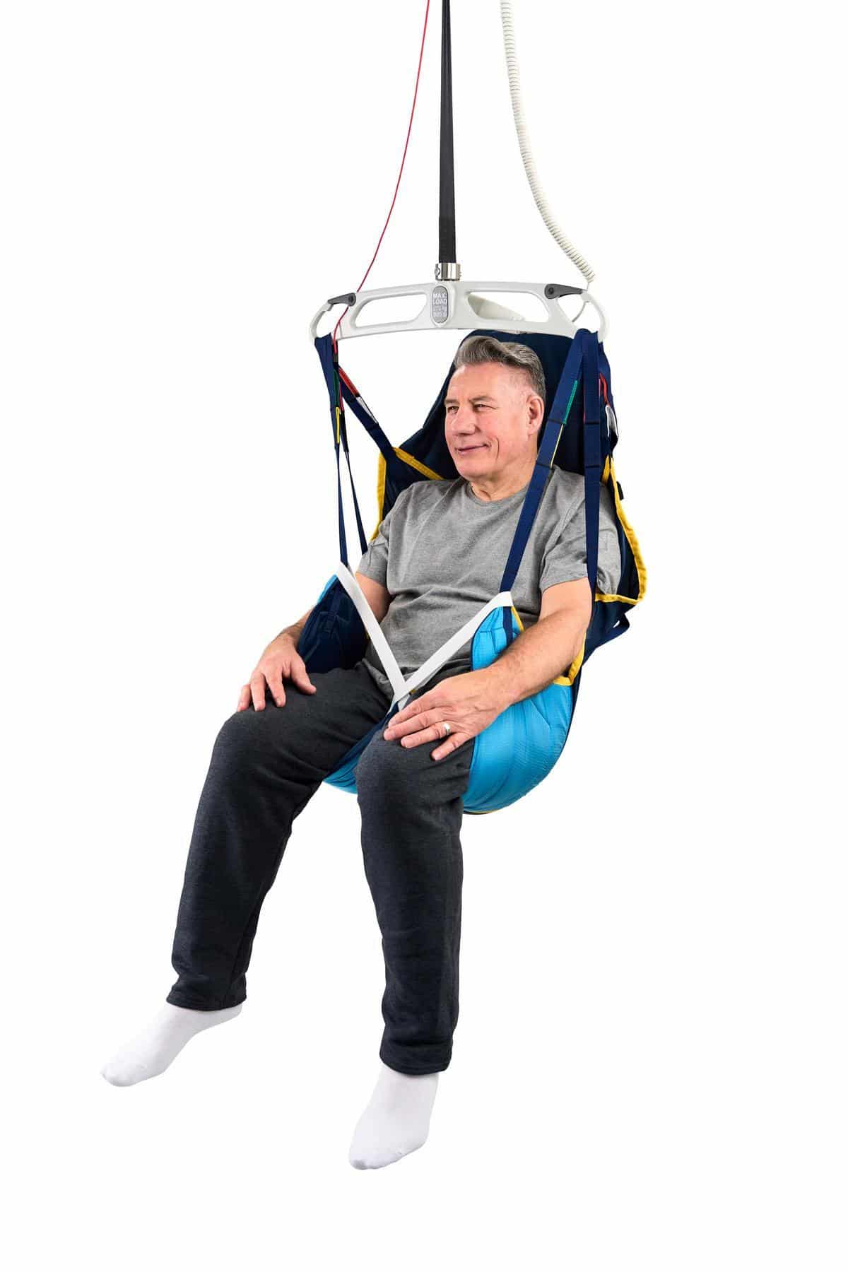 The Deluxe Hammock Sling with Head Support is a multipurpose hybrid sling designed for users who require additional support up to the shoulders and head during transfers. It combines the ease of application of a Universal sling with the neutral leg support of a Hammock sling, while supporting a range of seated and semi-reclined positions.
