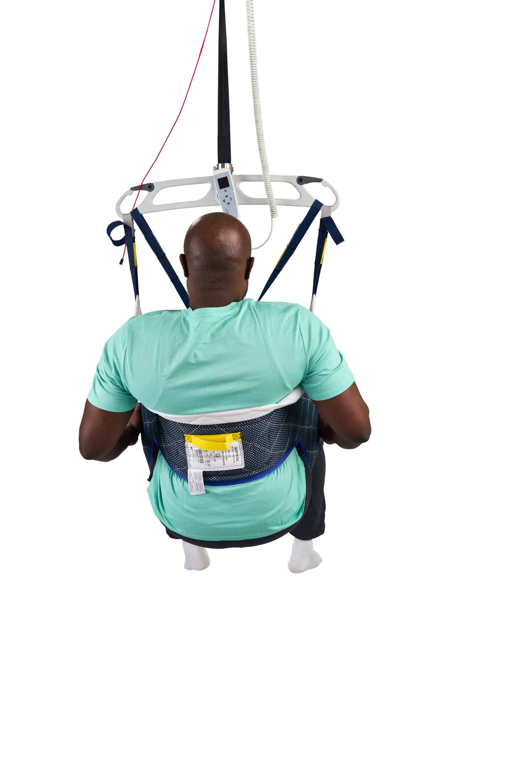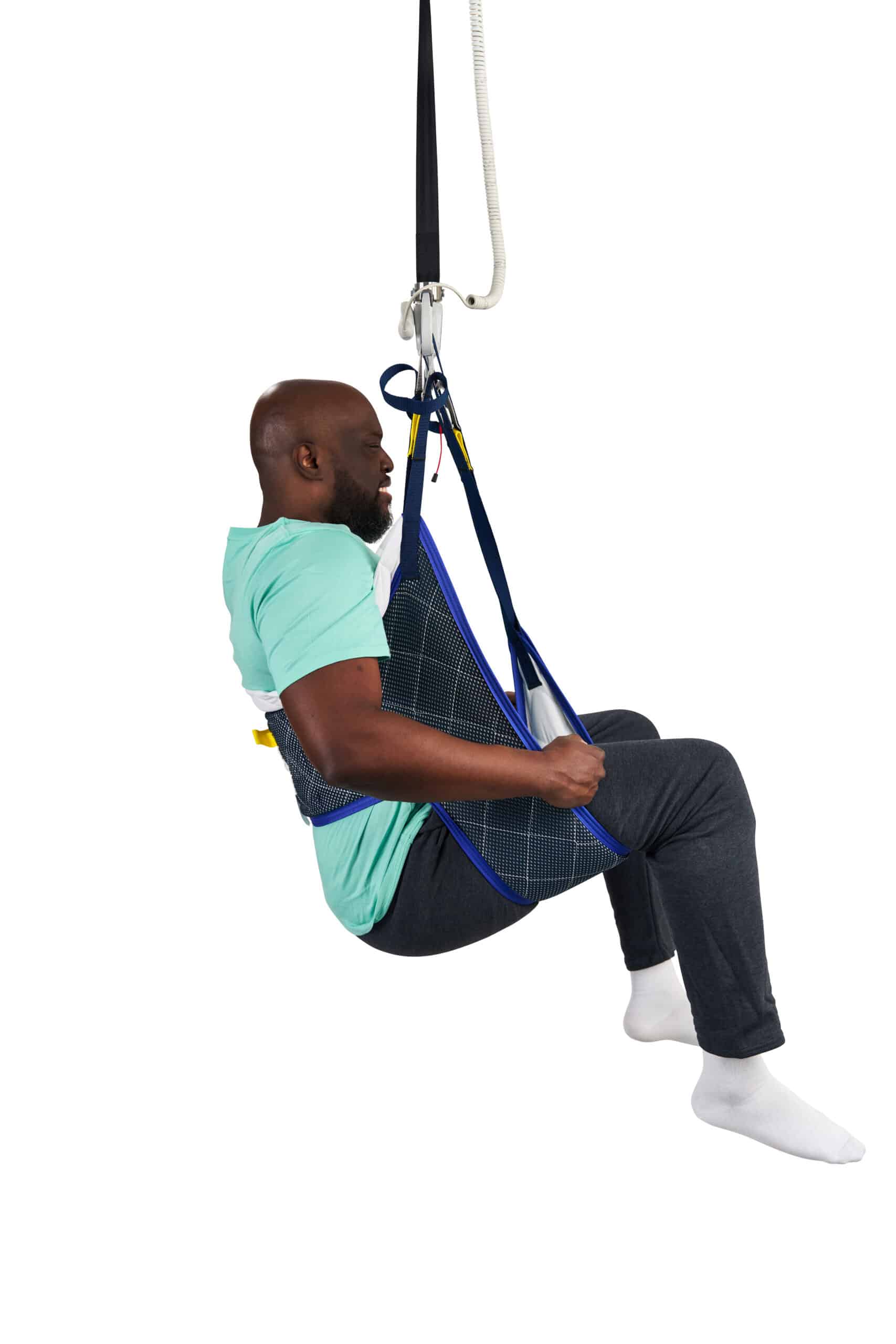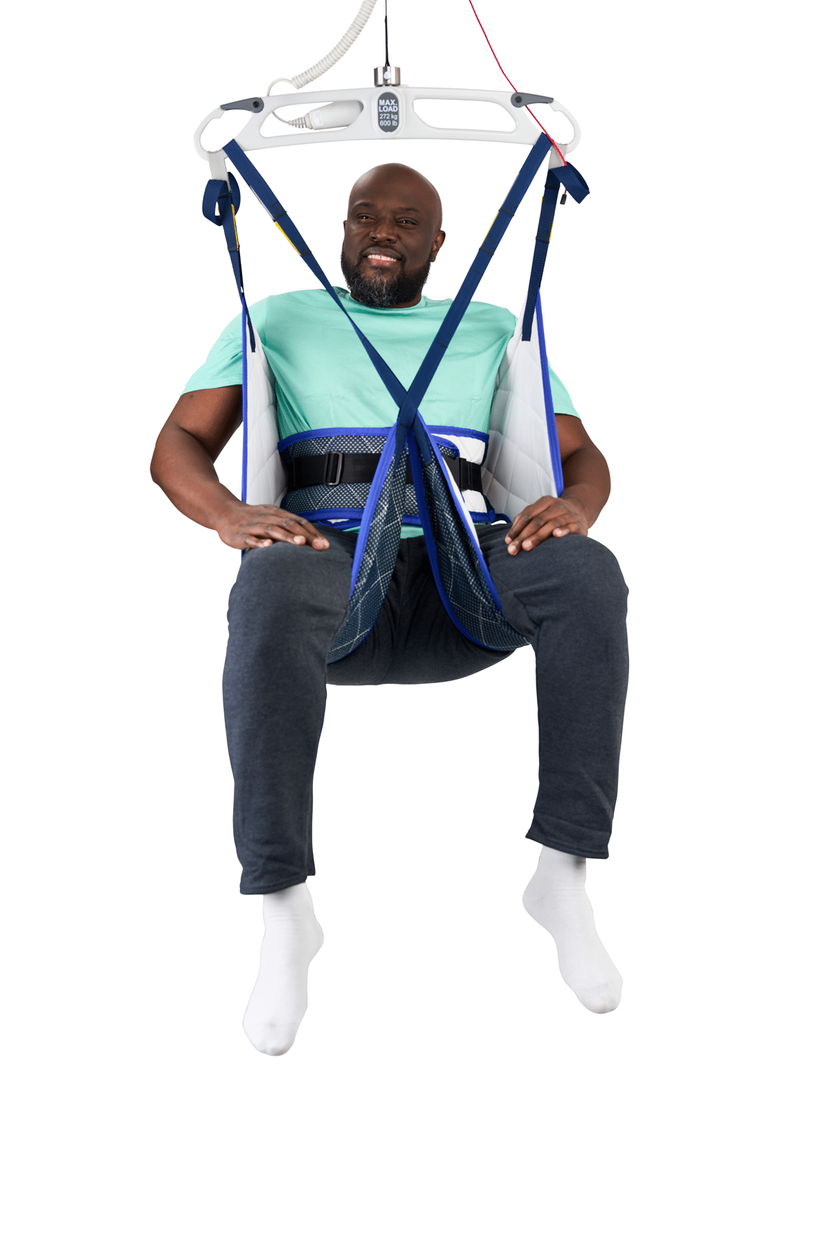 The Hygiene Sling is designed for toileting and hygiene routines, with unrestricted access for most users to support independent transfers and commode use. This toileting sling features soft quilted material, along with leg and shoulder straps that include multiple loop options for a range of seating positions. A wide chest strap with Velcro closure provides added upper body support and stability during transfers. Divided leg supports can be applied or removed while the user is seated, and the large commode opening allows easier access for hygiene tasks.