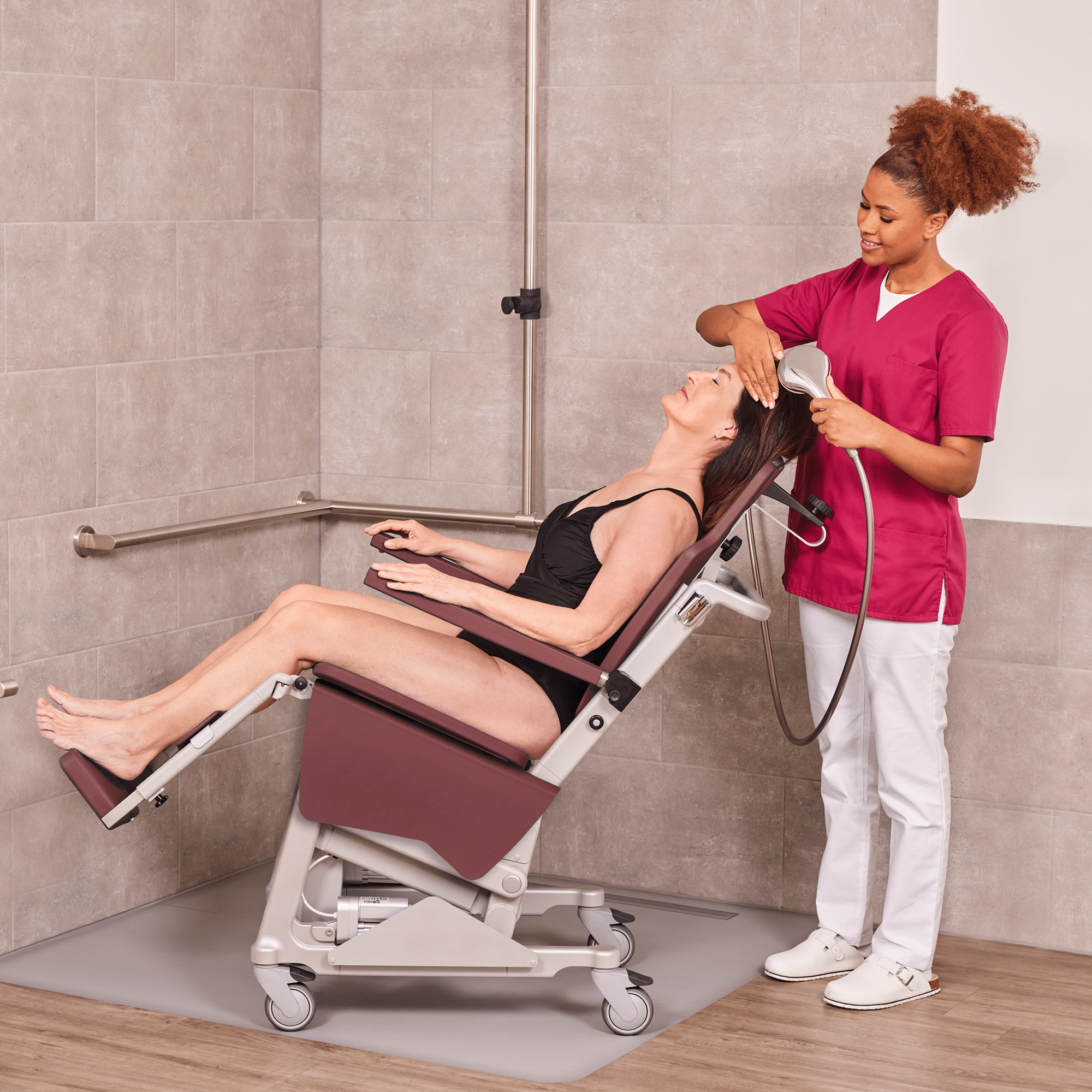 The Milo Shower Chair is an easy-to-use, comfortable solution that supports safe, dignified hygiene care for residents and ergonomic workflows for caregivers. It combines electrically powered, stepless tilt with a flexible cabled hand control for smooth, push-button positioning—plus a stable aluminum frame and soft PUR-foam cushions. Daily use stays simple with magnetic plug charging.