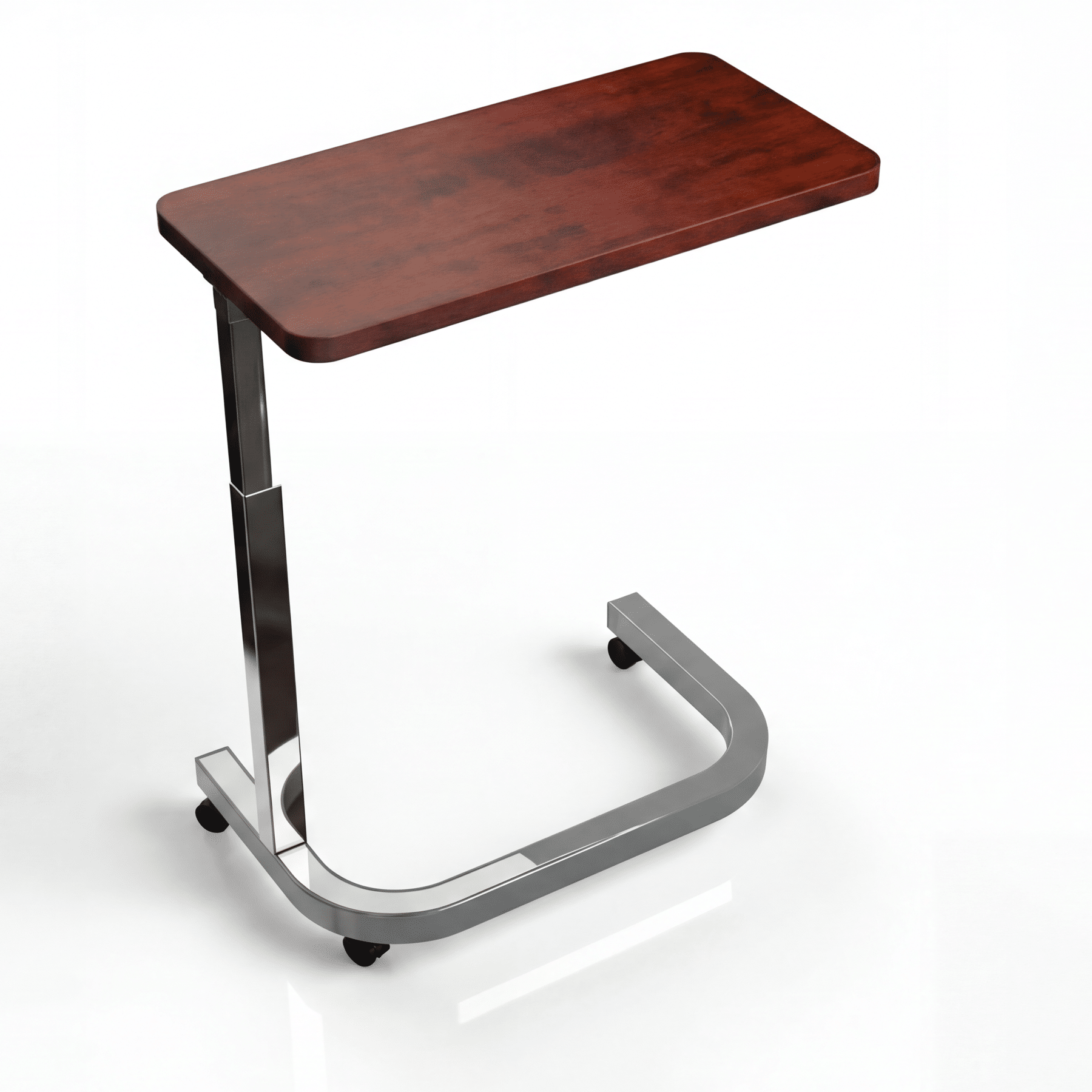 An overbed table (also called a hospital overbed table or bedside table) is a height-adjustable table that rolls over a bed or fits beside a chair. It gives patients a stable surface for meals, reading, a laptop, or personal items, and it can also be cleaned easily for bedside care.